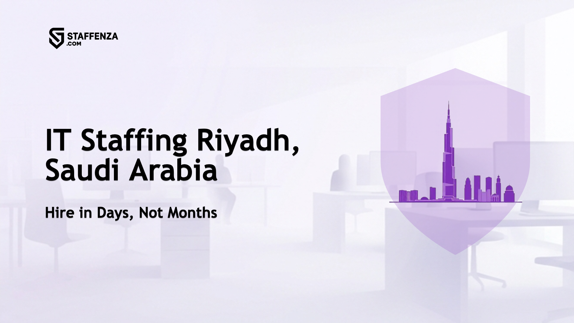 Staffenza places pre-vetted IT professionals in Riyadh. Hire developers, cloud engineers, cybersecurity experts, and data scientists. We handle visas, Saudization compliance, payroll, and onboarding. Typical placement 7 to 28 days with role-specific technical tests.