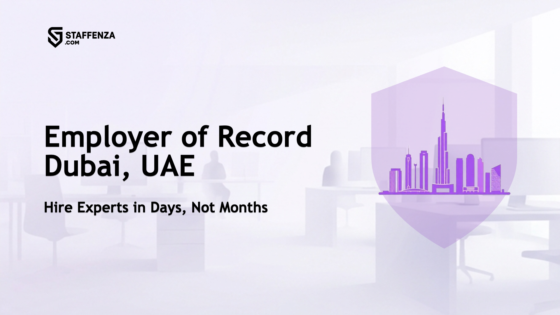 Staffenza is an Employer of Record in Dubai, UAE. We employ your staff under a local licence. We handle payroll, visa sponsorship, Emirates ID, work permits, health insurance, and WPS filings. Onboarding takes 2 to 6 weeks and fees are transparent.